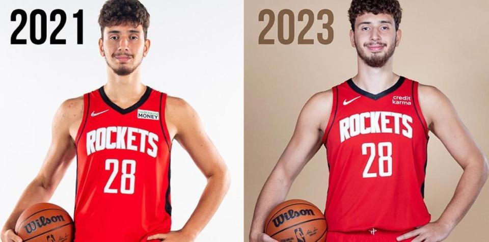 更重要的是,通过最近4年我们的观察,我们发现申京变得更加强壮了,至少从现在来看,他的体型变得更大了。我们也看到了刚加入NBA火箭队时申京的体型,以及2023年加入火箭队两年之后申京的体型,还有现在在欧锦赛当中申京拍摄的定妆照。